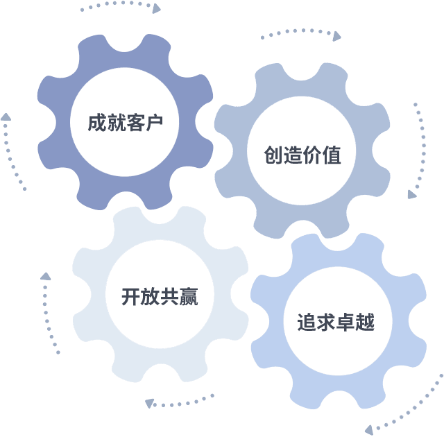 成就客户是一切决策的出发点,,,,创造价值是衡量所有工作的标准,,追求卓越是我们做事做人的态度,,,,开放共赢是我们的格局也是最终的结果。。价值观的齿轮环环相扣,,推动着组织里的每个人不断向前。。。