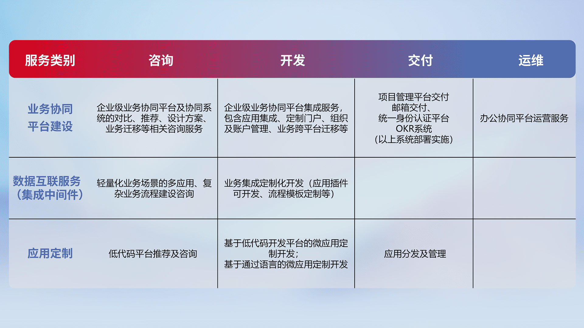针对钉钉、、、企微、、IDaas等平台级产品提供产品的规划、、方案、、、、交付、、、定制化开发等服务,,实现如统一协同办公、、、智能客户服务、、混合会议管理、、智能数据查询、、等业务场景,,,,实现数字化转型。。